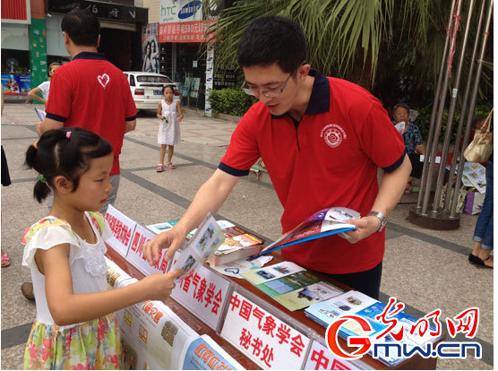 志愿者向小朋友发放气象科普宣传材料。 殷泓摄